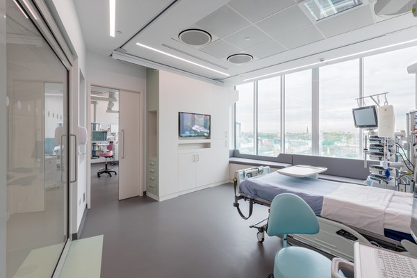 The development of the new ICU has been based on extensive research with the acoustics, lighting, layout and furnishing having all been selected for the patient’s brain, body and senses to rest and heal more effectively. The patient-focused environment includes, for example, media screens to enable engagement with the hospital’s arts in health programme and contact with family and friends, noise-reducing equipment, and the latest sensor technology to monitor patients’ health, progress and environment.