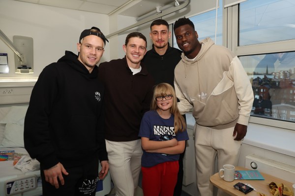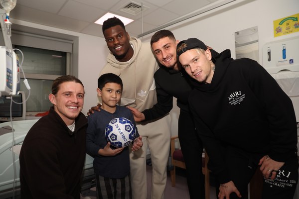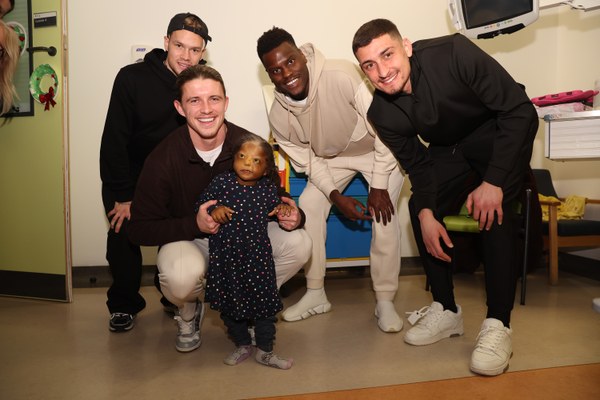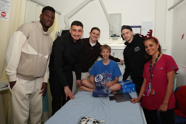 Djordjie Petrovic, Benoit Badiashile, Conor Gallagher, and Mykhailo Mudryk took time out of their busy schedules to visit our young patients and their families in the Neptune, Apollo and Mercury wards. The squad delivered presents, signed autographs and posed for pictures with the thrilled children, families and staff.