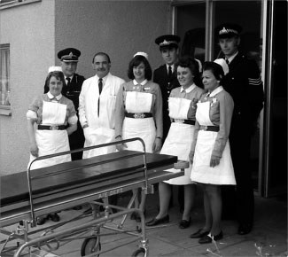 ![]() Nurses, a doctor and police outside West Mid A&E, 1977 |