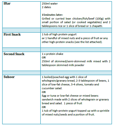 - Ensure good hydration; begin Iftar with 200-250ml of water. Aim to have at least 1.5L fluids per day.