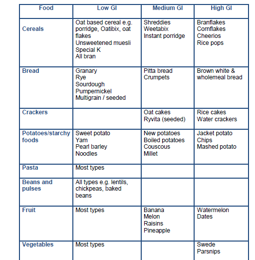 The Glycaemic Index is a method of ranking the carbohydrate in foods according to how they affect blood glucose levels. Low GI foods are more slowly digested and absorbed by the body resulting in a more gradual and smaller rise in blood glucose levels (and therefore insulin levels).