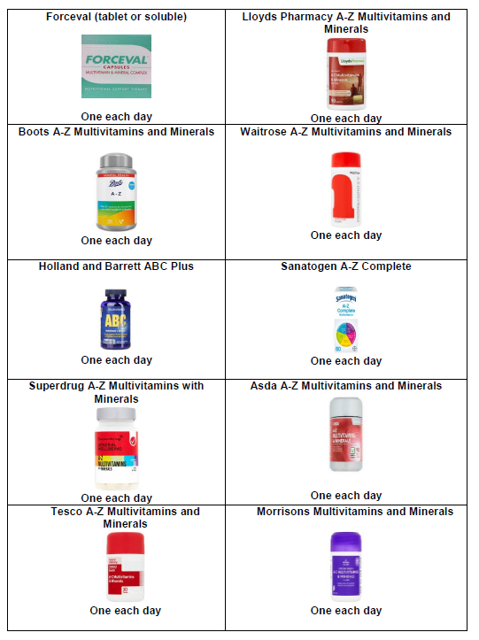 After your surgery you will need to take a complete multivitamin and mineral supplement every day for life (or for as long as you have a gastric band or balloon). Some multivitamins and minerals can be prescribed by your GP. Alternatively you can purchase some over the counter from pharmacies and supermarkets.