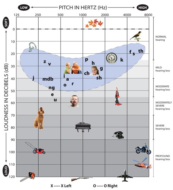 The chart below will help you to get a general view where specific speech and environmental sounds lie. From top to bottom, you can see that sounds are getting louder, and from left to right, the tone of each sound is getting higher in pitch. This may help you and your family to understand the difficulties you are experiencing during communication.