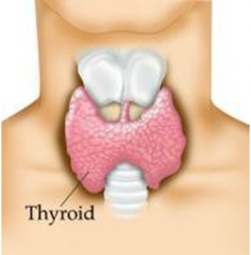 The thyroid gland is a small, butterfly-shaped gland located at the front of the neck (below the Adam’s apple). A gland is a group of cells which produces a substance such as sweat, saliva or tears. There is a variety of them all over the body.