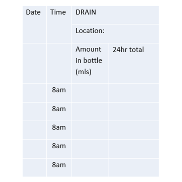 The nurse will show you how to measure the drain bottle. It is important that the drain bottle is on a flat surface when being measured.