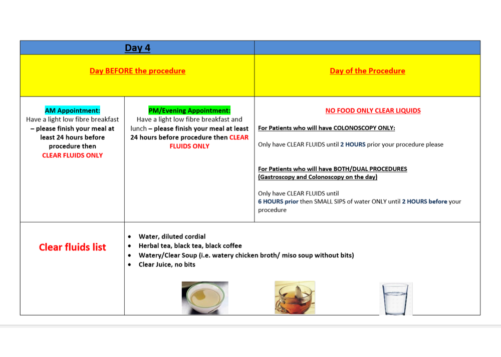Bowel Preparation – Low Fibre Diet 4 days before endoscopy procedure