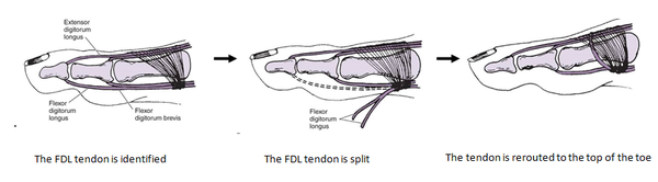 A tendon transfer involves taking a tendon from the bottom of the toe and re-routing it to the top of your toe.