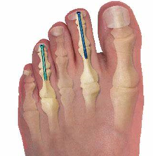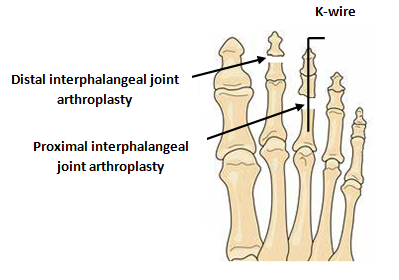 This describes the permanent application of an implant to fuse the digit in a straight position. A potential risk with this type of procedure is difficulty removing the implant in the case of irritation or revision surgery. Compared to percutaneous k-wires, which are easily removed from the end of the toe after 4-6 weeks, implant removal is more invasive and traumatic.