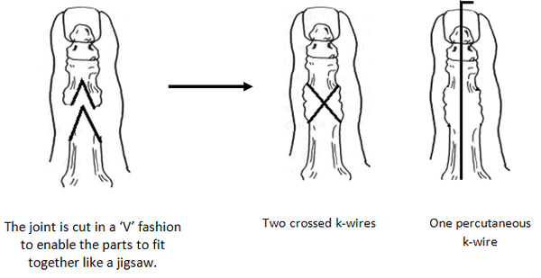 An incision is made over the top of the joint, the bone is cut, soft tissues repaired and closed with non-dissolvable sutures. The alignment may or may not be maintained with a percutaneous K wire (visible at the end of the toe) which remains in place for 4-6 weeks.