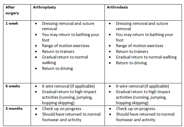 A soft tissue release and tendon lengthening or repair might be required, to ensure a good position with either procedure. The choice between an arthrodesis and an arthroplasty will be made by your consultant.